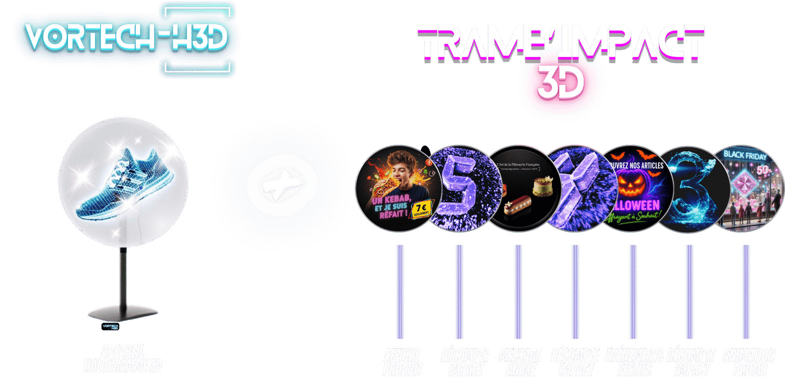 Associez la puissance du Vortech H3D à un scénario Tram’impact 3D pour sublimer votre image de marque. Logo 3D, présentation produit ou message commercial : nos packs clés en main allient technologie holographique et storytelling visuel pour capter l’attention et propulser votre présence.